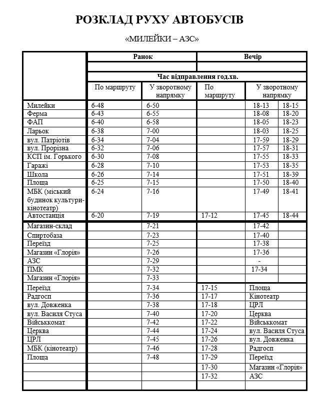 Цього року міський автобус у Корюківці відновив роботу 27 жовтня. Це транспорт загального користування, який рухається за маршрутом «Милейки – АЗС». Фактично він возить людей через увесь населений пункт, з одного віддаленого мікрорайону «Милейки» в інший – «Олексіївка».