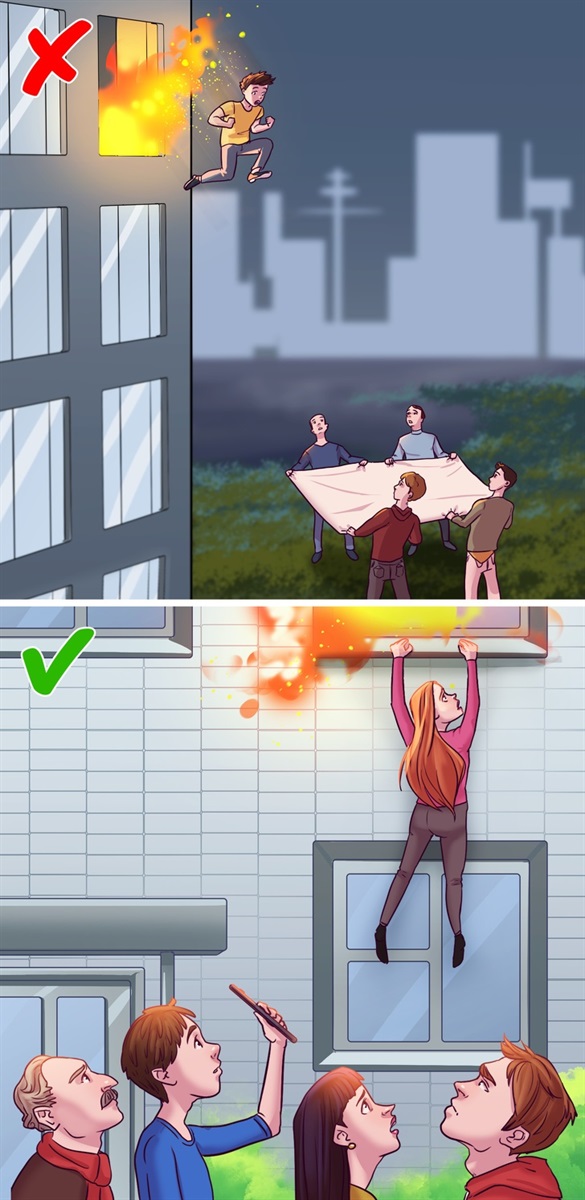 Якщо вогонь проник у кімнату — спробуйте вибратися з вікна, використовуючи простирадла або інші підручні засоби як мотузки.