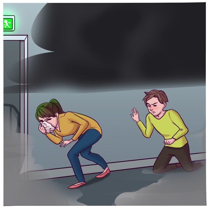 У задимленому приміщенні йдіть до виходу, тримаючись за стіни, щоб не втрачати орієнтацію. Пересувайтеся поповзом або пригнувшись, оскільки дим йде вгору і на рівні підлоги дихати трохи легше.
