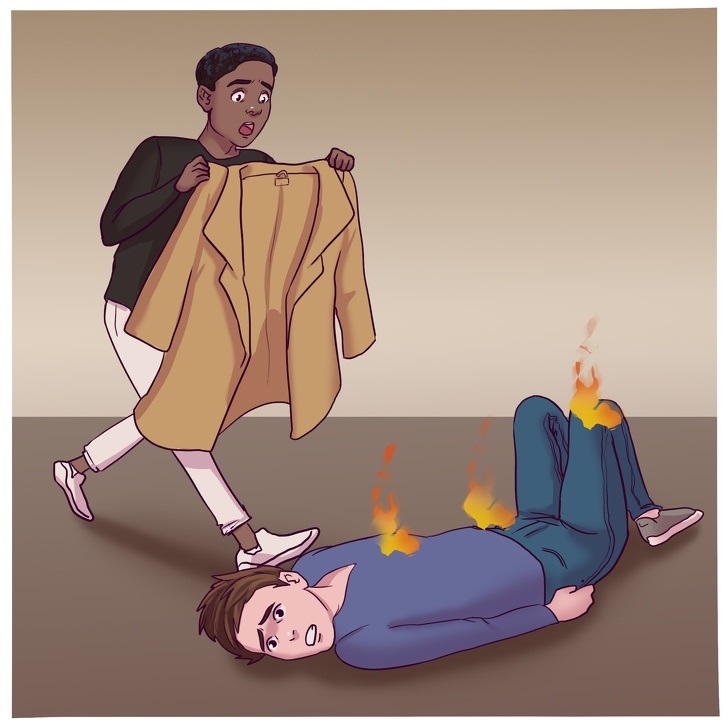 Якщо одяг горить на іншій людині, потрібно накинути на неї щось щільне, наприклад, килимок або пальто.